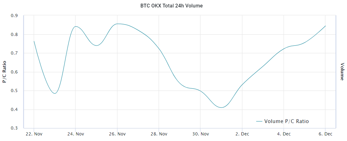 OKX比特币期权的数据显示,相对于看涨期权,看跌期权的需求不断增加。这表明这些巨鲸和做市商可能没有预料到价格上涨。尽管如此,交易员并没有押注价格下跌,因为该指标在交易量方面有利于看涨期权。对看跌(卖出)期权的过度需求将使该指标超过1.0。