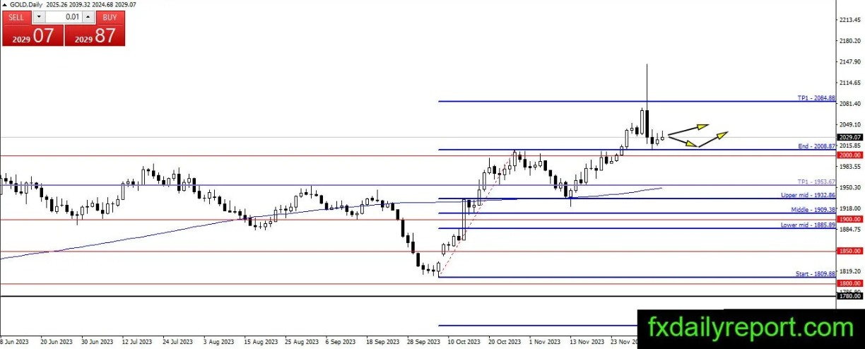 金价出现看涨反弹,但看涨势头并不强劲。价格似乎难以继续上涨,因此仍有可能下跌以测试2,000美元大关。交易者将在接近该点时为看涨反应和进入多头头寸的机会做好准备。