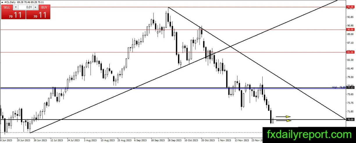 目前原油价格形势相当悲观,价格低于70.00美元。看跌压力尚未消退,因此仍有走软的可能性。然而,如果价格能够维持在70.00美元附近并盘整,那么近期有可能出现上行反弹。