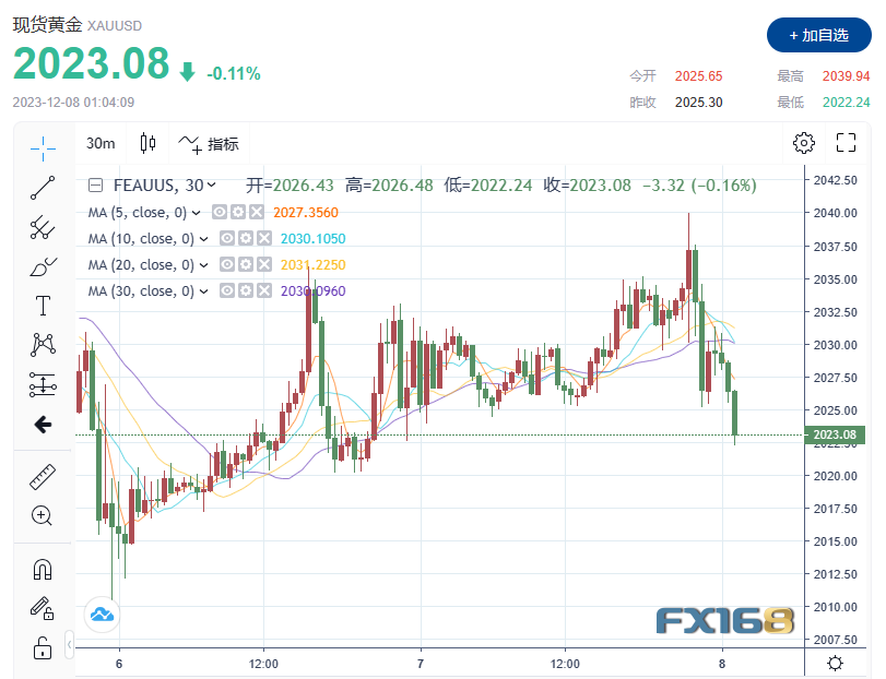 数据公布后,现货黄金短线一度拉升9美元至2039.94美元高点,但随后很快自高位大幅回落并刷新日低至2022.21美元。