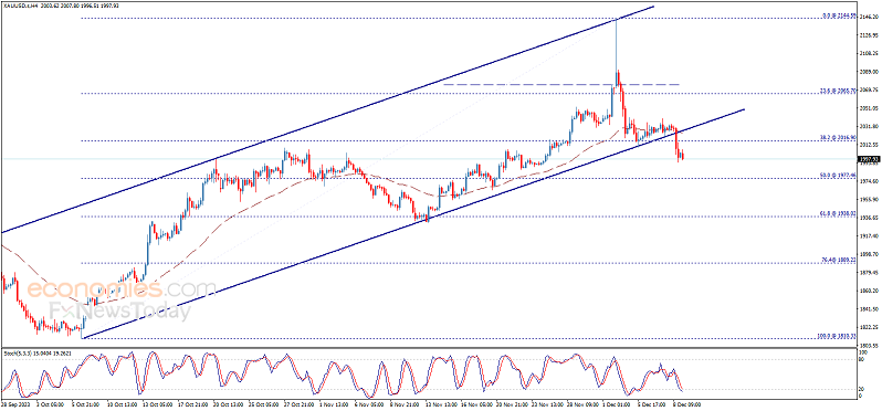 从4小时图来看,金价上一交易日收于看涨通道支撑线下方,从而确认跌破这一水平。金价开始针对始于1810.33美元/盎司区域升势的看空调整走势,有望测试下一回调目标1977.46美元/盎司。假如金价跌破这一水平,这将推动金价跌至下一看空目标1938.00美元/盎司区域。
