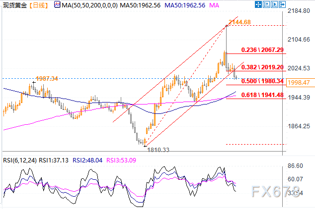 在下行路上,若金价日收市价低于2000美元/盎司,这可能会吸引技术卖家,并为金价跌向1980美元/盎司(10-12月涨势的50%回档)和1960美元/盎司(50日均线)打开大门。