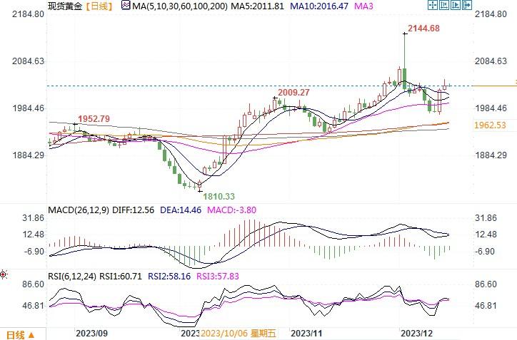 周四(12月14日),金价周四触及10日高位2047.49美元/盎司,收盘上涨0.5%报2,036.69美元/盎司。