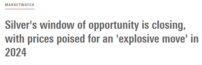 24K99讯 GoldSeek总裁兼首席执行官Peter Spina表示,如果全球供应继续低于需求,并且美联储兑现其在未来几个月转向降息的计划,白银价格可能会迎来爆炸性走势。他指出,白银的机会之窗正在关闭,展望2024年银价将触及50美元。