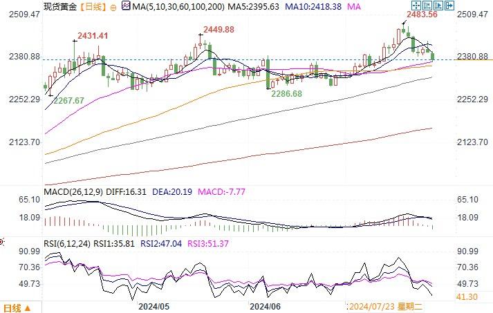 周三(7月24日),现货金收盘报每盎司2397.58美元,下跌0.52%,盘中一度高见2431.89美元。虽然要面对本周随后一些重要数据的考验,黄金仍稳固在2400美元附近。