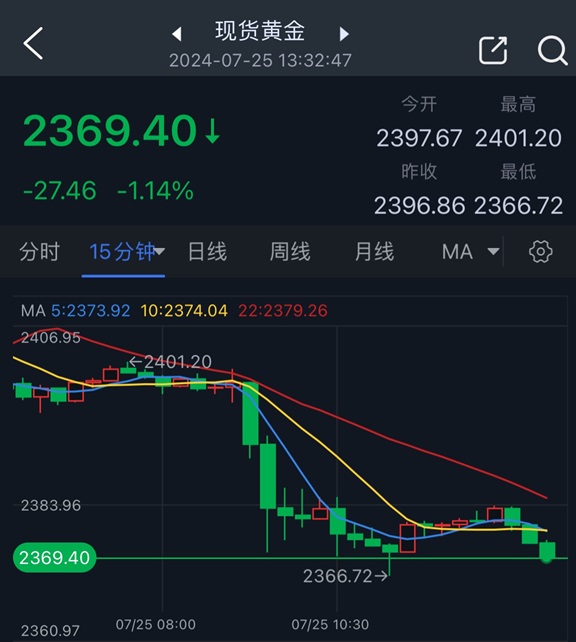 现货黄金周三收盘下跌0.51%,报2396.86美元/盎司。金价周四盘中最低跌至2366.72美元/盎司。
