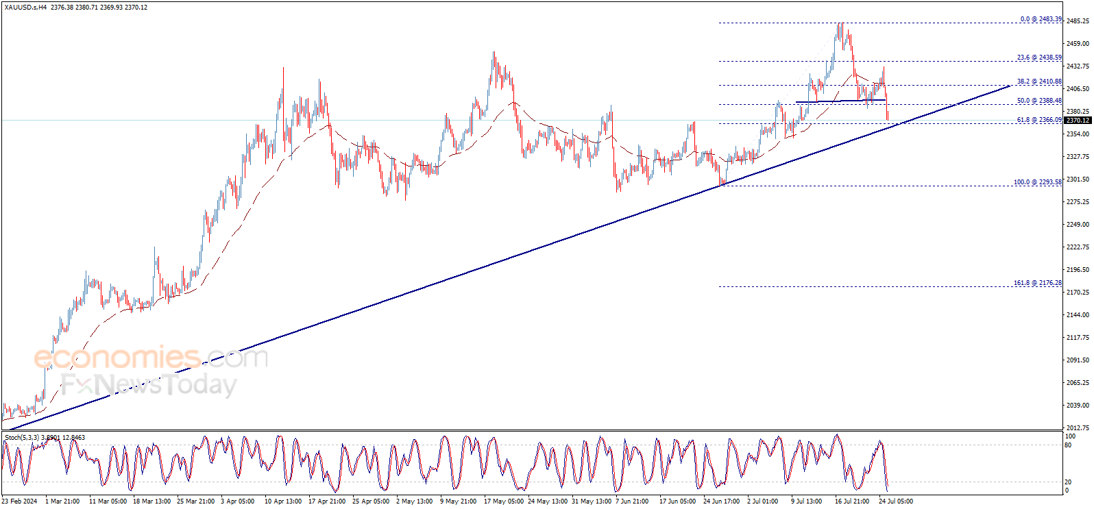 根据Economies.com,金价在大跌后已经接近第二看空目标2366.10美元/盎司。一旦跌破主要看涨趋势线,金价可能遭遇更大跌势。