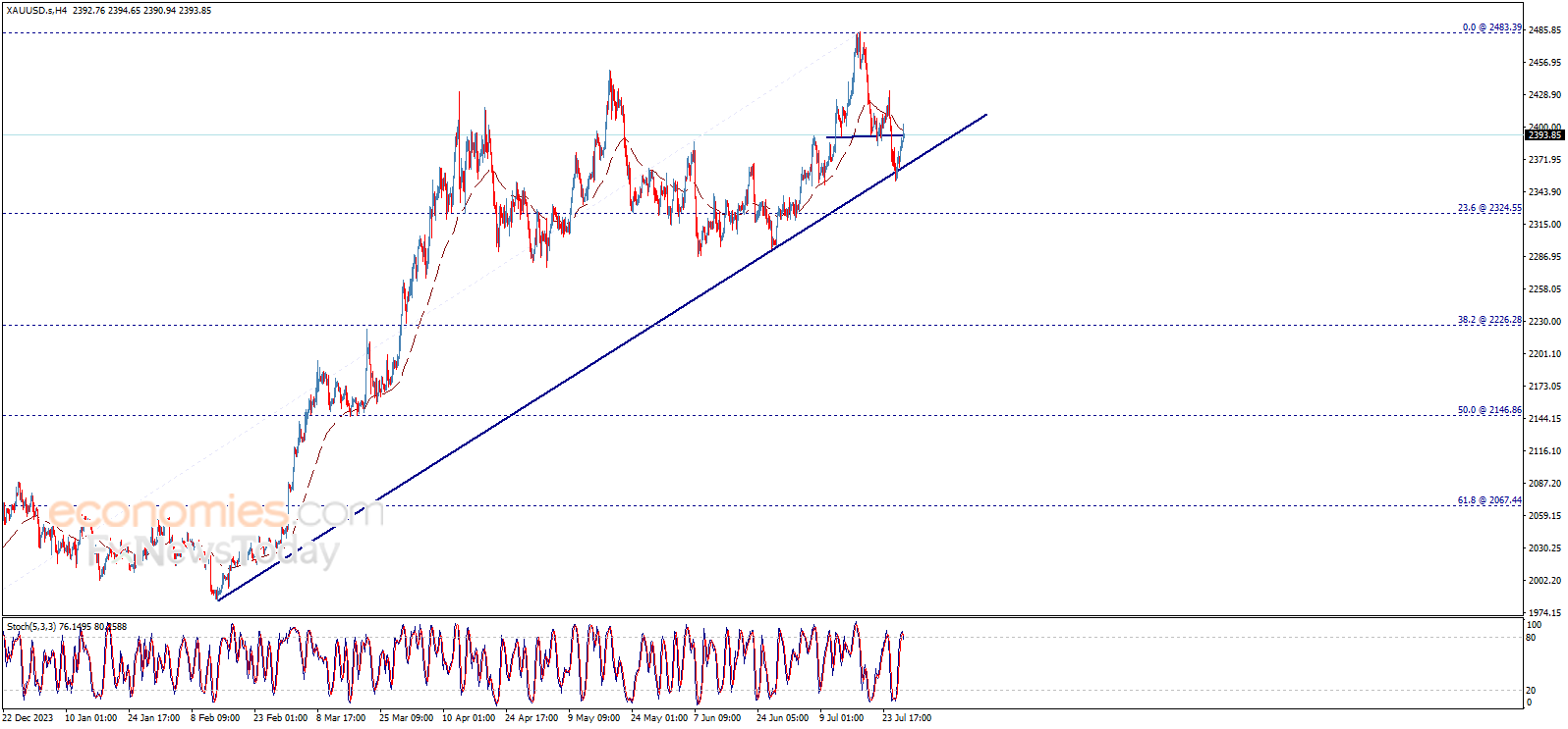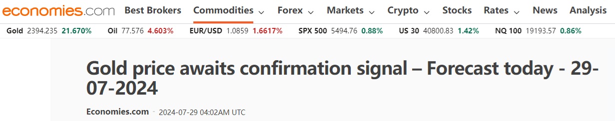 周一(7月29日)亚市尾盘,现货黄金维持日内温和张涨幅,目前金价目前略低于2394美元/盎司。知名财经资讯网站Economies.com周一最新撰文,对日内黄金技术前景进行分析。
