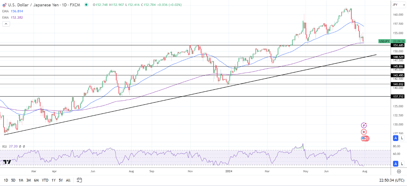 美元/日元重返155点位可能支撑其向50日均线移动,突破50日均线则有望触及160点。