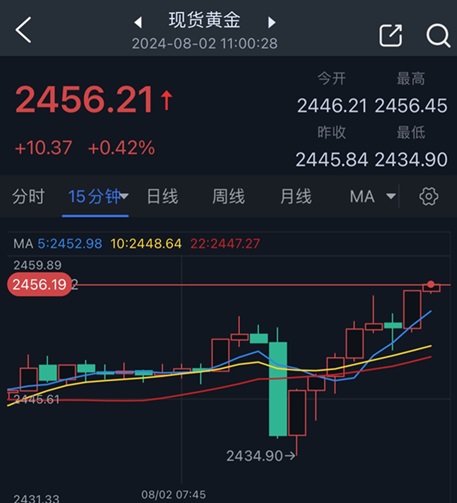 北京时间11:00,现货黄金报2456.21美元/盎司。