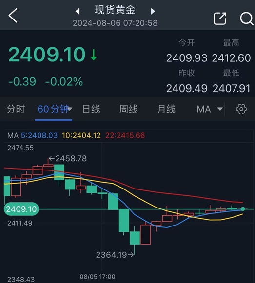 周一亚市盘中,现货黄金一度触及2458.78美元/盎司,这是日内高点;随后金价出现暴跌,欧洲时段盘中金价一度跌至2364.19美元/盎司,创下日内低点。随后金价出现大幅反弹,最终收盘报2409.49美元/盎司。