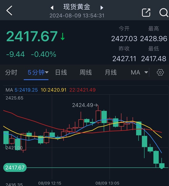 24K99讯 周五(8月9日)亚市尾盘,现货黄金短线突然快速下滑,金价刚刚跌破2420美元/盎司,日内下跌近10美元。知名财经资讯网站Economies.com周五最新撰文,对日内黄金技术前景进行分析。