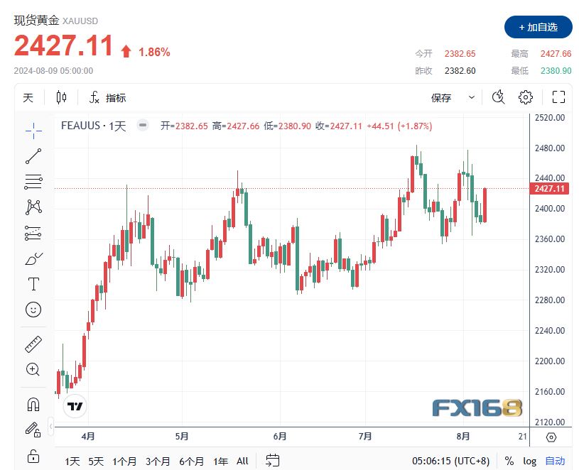周四(8月8日),受稳固的避险需求和对美联储 9 月份大幅降息的预期升温支撑,黄金大幅上涨,突破 2410美元/盎司,上涨逾 1%,有望结束连续五天的下跌趋势。尽管美元再次走强且美国收益率上升,但 黄金在突破 2400美元/盎司后似乎吸引了技术买家。