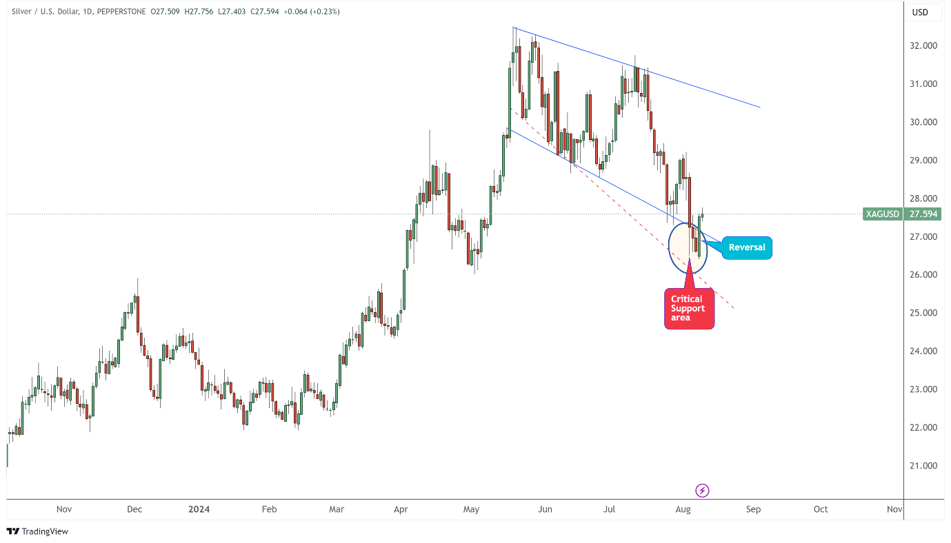 白银达到了2024年强有力的支撑位,如下面的日线图所示的关键支撑区域所示。图表中的蓝色通道线突出显示了这一关键支撑。该通道下方的红色虚线形成了一个下降的加宽楔形。
