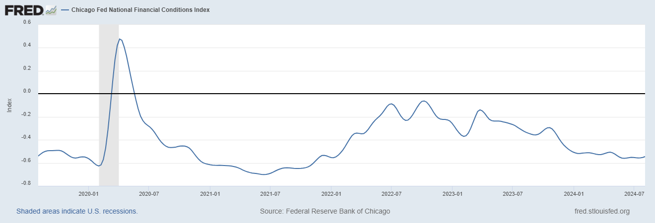 当前金融环境的特点是市场流动性稳定,芝加哥联储金融状况指数下降至-0.546,如下图所示。