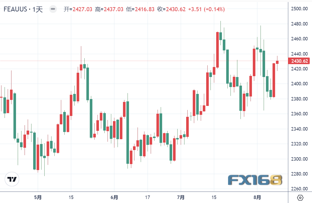 上周出市场恐慌抛售令黄金沦落为牺牲品,上周一疯狂巨震超90美元,一度触及2364美元,上周四大幅反弹逾40美元至2420美元上方,上周跌幅缩减至10美元左右,最终收跌0.42%。
