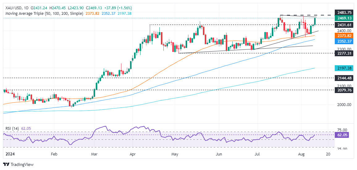 主要受中东紧张局势升温影响,现货黄金周一(8月12日)暴涨逾40美元,收盘位于2470美元/盎司上方。目前黄金多头目标是冲击历史高位。