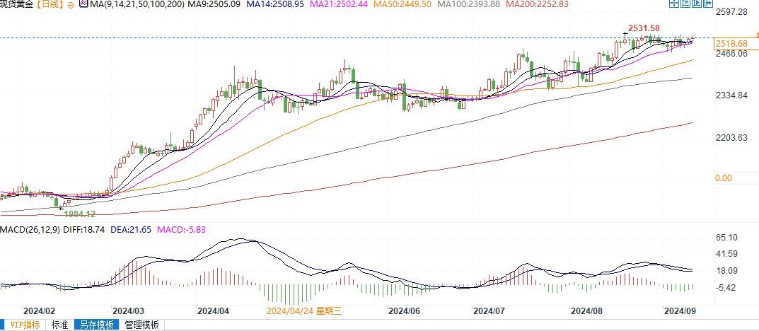 北京时间9月11日10:24,现货黄金报2518.64美元/盎司