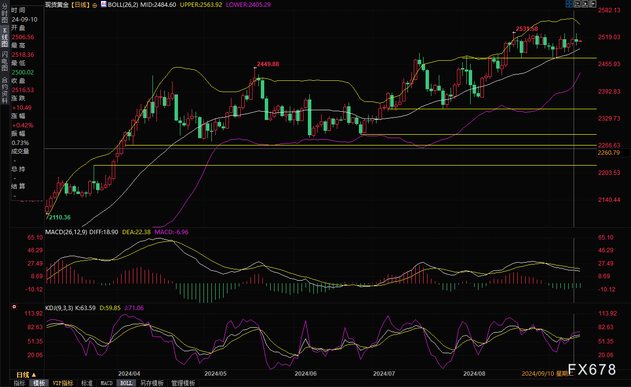 —周四(9月12日)窄幅震荡,现货黄金目前交投于2512.46美元/盎司附近。金价周三冲高回落,受避险买盘支撑,金价周三盘中早些时候一度升至2529美元附近,逼近历史高位,但在美国CPI数据后,金价回吐涨幅,一度跌至2500关口附近,收报2511.33美元/盎司,因美国通胀数据促使投资者缩减对美联储下周超大规模降息的预期,美元和国债收益率走强。