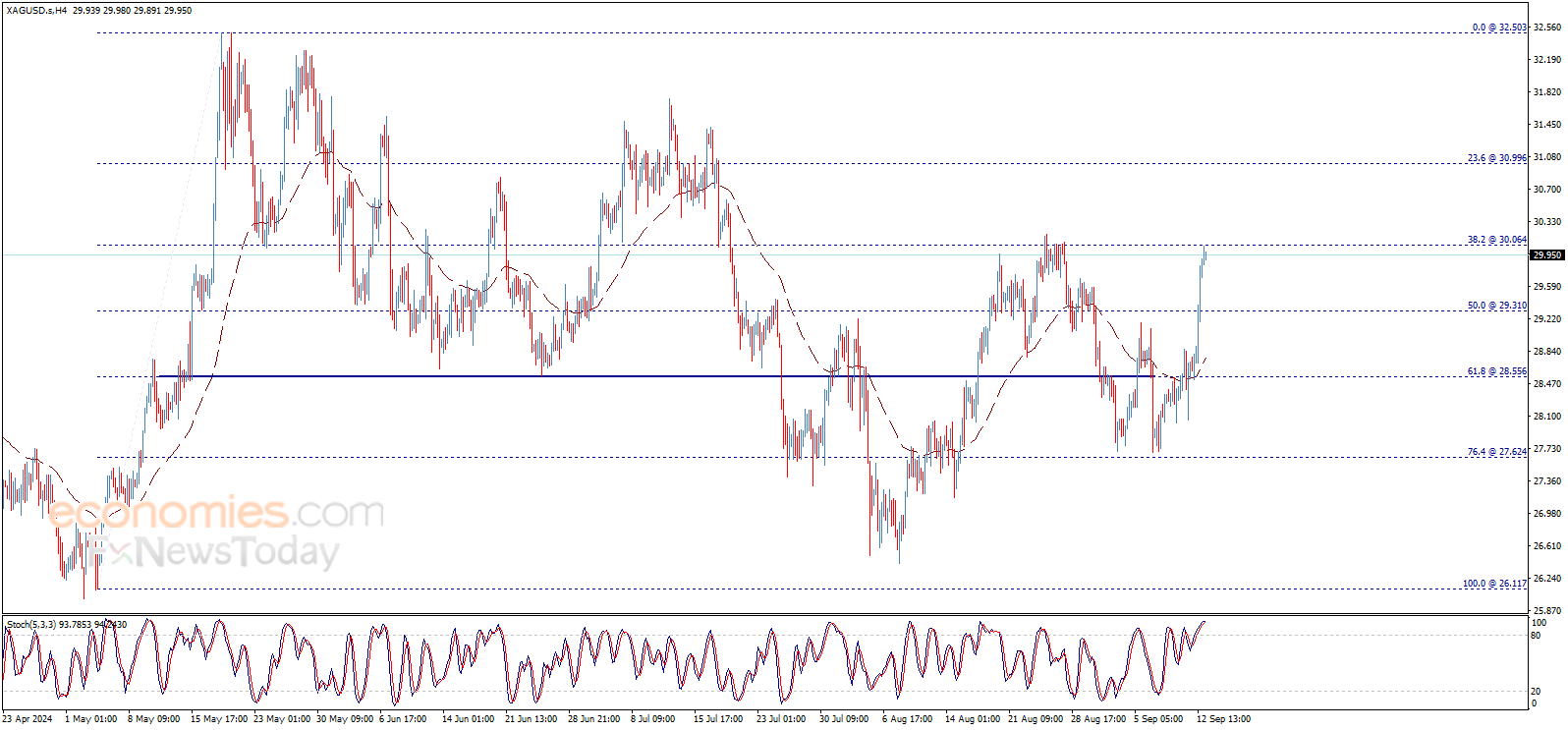 Economies.com称,因此,我们将继续预测银价在未来一段时间内处于看涨趋势。4小时图显示,50周期指数移动平均线(EMA)对银价构成支撑。需要考虑到的是,假如银价未能攻克30.06美元/盎司,这可能迫使银价出现一些跌势,测试关键支撑29.30美元/盎司,然后重新尝试上涨。