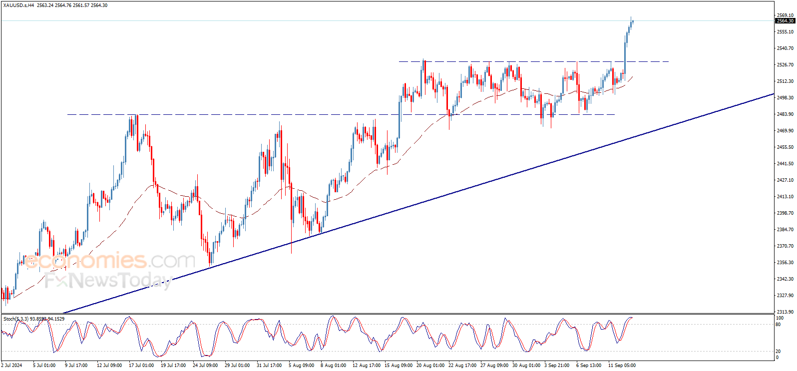 Economies.com在文章中写道,黄金价格显现更多升势,目前已经触及2565.00美元/盎司区域,从而强化金价在中短期内继续看涨趋势的预期。我们相信,金价升至下一主要目标2600.00美元/盎司的道路已经打开。从4小时图来看,50周期指数移动平均线(EMA)对金价构成支撑,这支持看涨预期。