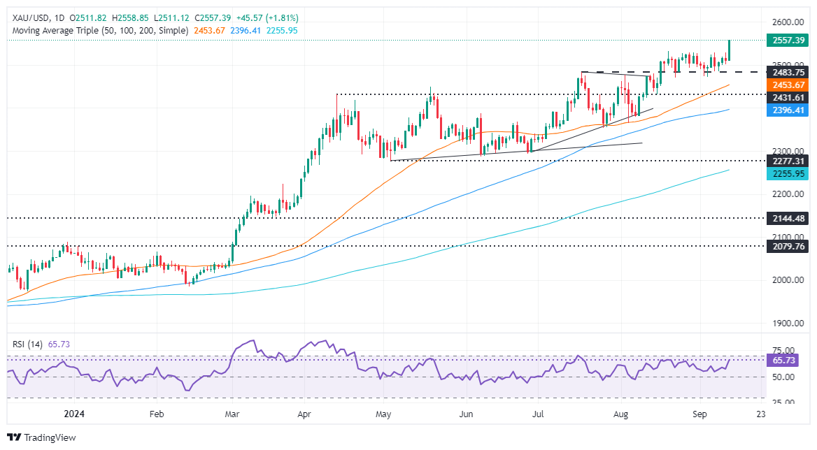 FXStreet分析师Christian Borjon Valencia指出,黄金价格周四暴涨,突破了此前的历史高位2531美元/盎司以及2550美元/盎司关口,创下新的历史高位。尽管金价与美国国债收益率之间的负相关关系在当天被打破,但金价的上行势头仍在加速。