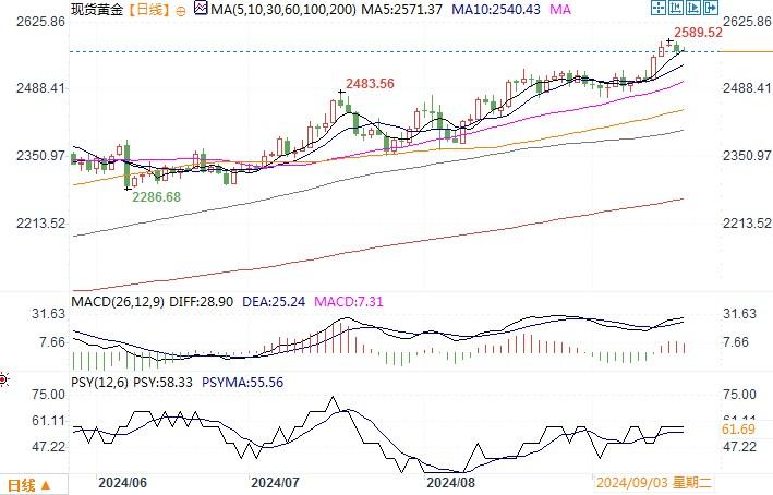 周二(9月17日),金价在上一交易日攀升至历史新高后于周二回落,现货金下跌0.5%收盘在每盎司2,569.43美元,周一曾触及2,589.59美元的历史新高。周二美国零售销售数据增长意外超出预期,令美元和美债收益率出现反弹,稍稍抑制了黄金的冲高热潮。