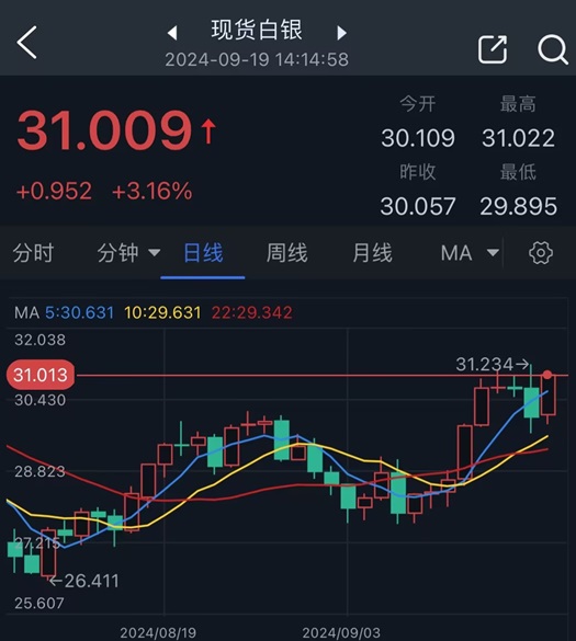 24K99讯 周四(9月19日)亚市尾盘,现货白银维持日内强劲反弹走势,银价刚刚触及31.00美元/盎司关口,日内大涨逾3%。知名财经资讯网站Economies.com周四最新撰文,对白银走势进行前瞻分析。