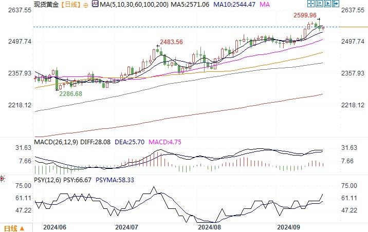 周三(9月18日),现货金纽约尾盘下跌0.7%,收盘报每盎司2,552.49美元,稍早在美联储利率决议公布后一度创下2,599.92美元的历史纪录新高。虽然周三美联储意外大幅降息50个基点,但美联储主席鲍威尔在大幅降息50个基点后做出的中性偏鹰发言推动美元和美国公债收益率上涨,触发现货金周三从历史纪录高位退潮。