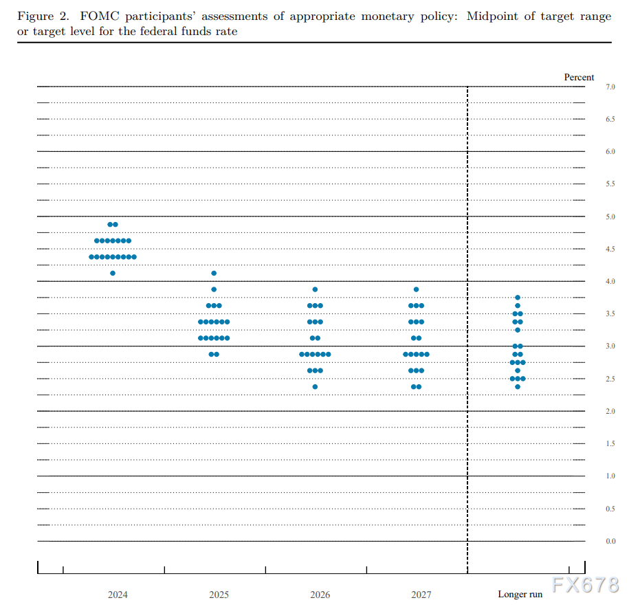 根据美联储的点阵图,到2024年底,利率将降至4.375%,这暗示今年将再降息约50个基点。对 2025 年底的预测暗示利率将再下调 100 个基点,2026 将降息 50 个基点,指标利率目标区间最终将降至2.75%-3.00%。