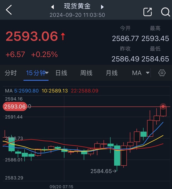 北京时间11:03,现货黄金报2593.06美元/盎司。