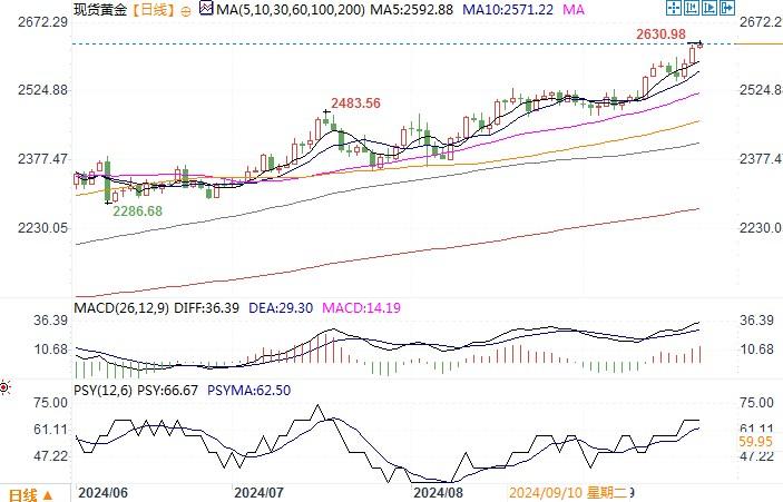 周五(9月20日),现货金上涨1.3%,收盘报每盎司2,621.95美元,金价周五首次突破2,600美元大关,且盘中屡创纪录高点,延续了受美联储开启降息周期事件发酵提振的涨势。