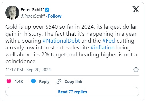 与此同时,经济学家希夫(Peter Schiff)在9月20日的一篇文章中指出,随着金价的上涨,投资者应该预期金价会进一步上涨,并警告称经济可能进一步放缓。
