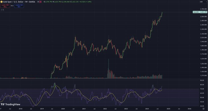 Cryptoinsightsuk写道:“这里可能有什么隐忧吗?我不确定是什么,但黄金已经有20多年没有这样的表现了。”