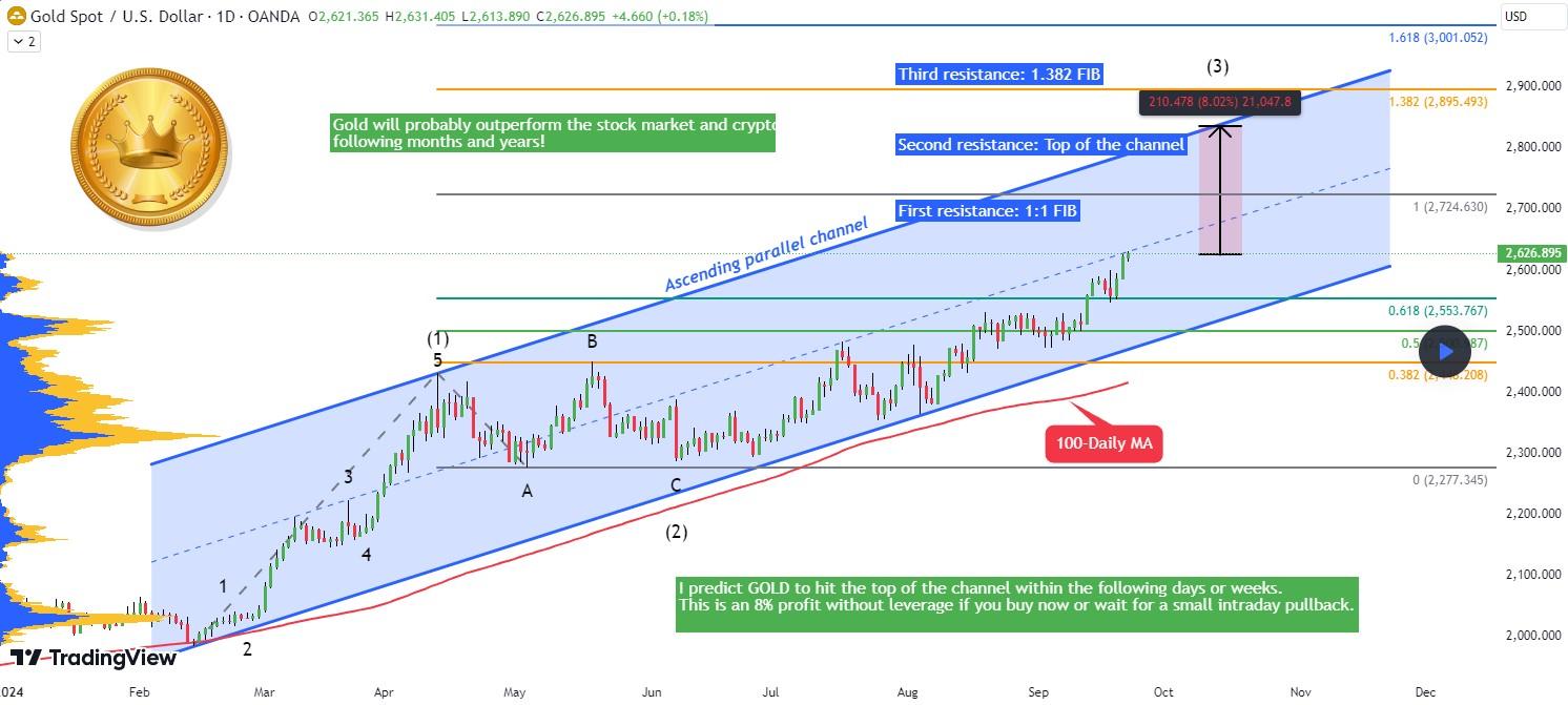 按照他的说法,现在金价处于上升的蓝色平行通道内,当然非常看涨。他预测黄金将在未来几天或几周内达到通道顶部。如果投资者现在买入或等待盘中小幅回调,这将是8%的无杠杆利润。从艾略特波浪的角度来看,黄金处于第3浪中,通常第3浪是最强的。”