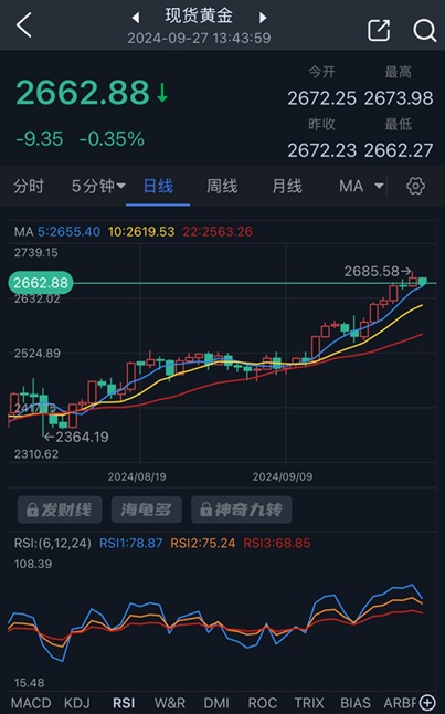 周五(9月27日)亚市尾盘,现货黄金短线突然快速下滑,金价目前跌至2663美元/盎司附近,日内重挫近10美元。