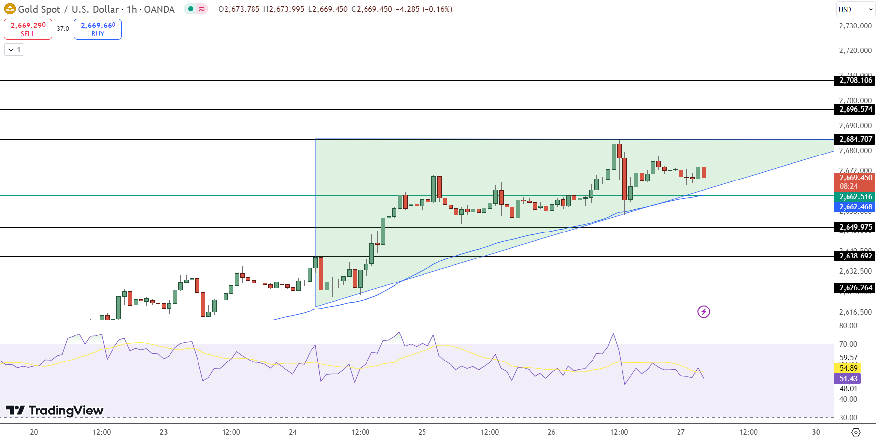 当前上升三角形形态支撑金价接近2665 美元,且由于美联储鸽派预期,美元可能走弱,金价似乎有望进一步上涨。