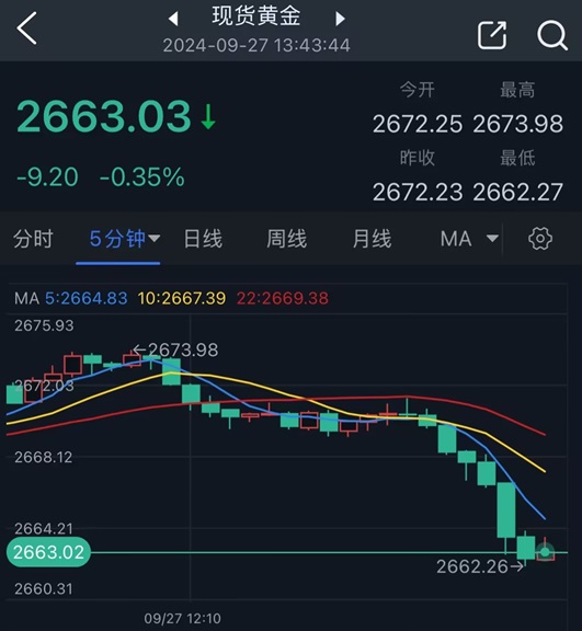 北京时间13:43,现货黄金报2663.03美元/盎司。