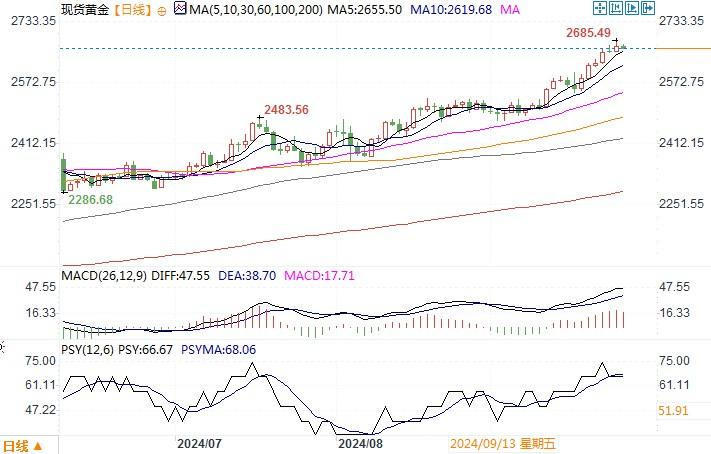 技术层面,黄金价格周四触及2685美元/盎司的纪录高位,各项技术指标保持上倾仍然对买家有利。如果金价延续涨势,突破今年迄今的峰值2685美元/盎司,下一个阻力位将是2700美元/盎司大关。一旦金价攻克上述阻力,那么金价将进一步瞄准2750美元/盎司,然后是2800美元/盎司。另一方面,如果金价高位出现获利调整的走势,下方初步支撑在2650美元/盎司,若跌穿该支撑,进一步则有望测试9月18日高点2600美元/盎司。若黄金继续回落,那么金价接下来要测试的关键支撑位将是9月18日低点2546美元/盎司,之后是50日简单移动平均线(SMA)2488美元/盎司。