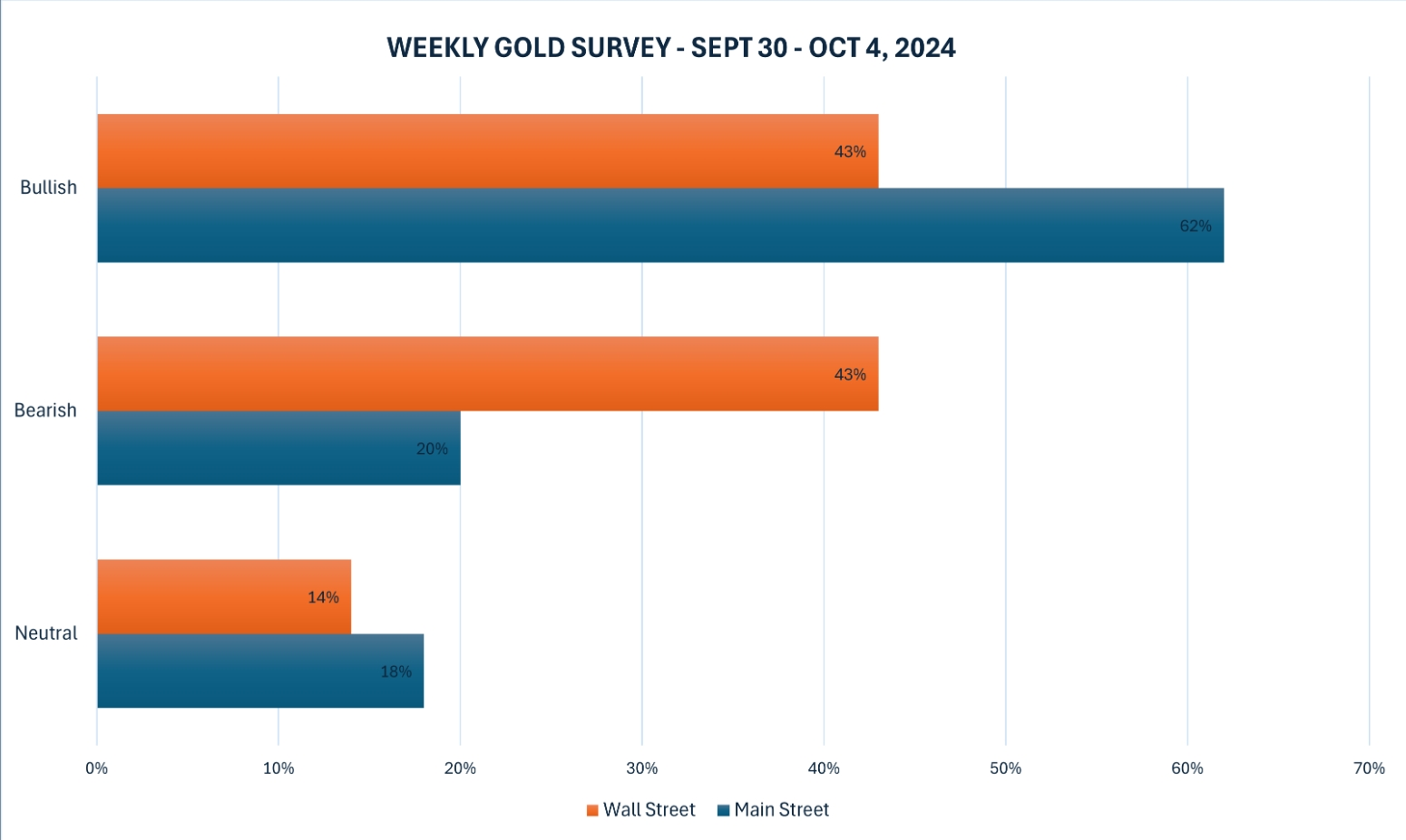 在Kitco News的黄金走势调查中,共有14名分析师参与,调查结果显示华尔街的分析师对黄金的看法分裂。43%的分析师看涨,43%看跌,剩下14%认为黄金将横盘整理。而在Kitco的在线调查中,192名散户投资者参与了投票,其中62%预期黄金价格将上涨,20%预期下跌,剩余17%认为黄金价格将保持横盘。