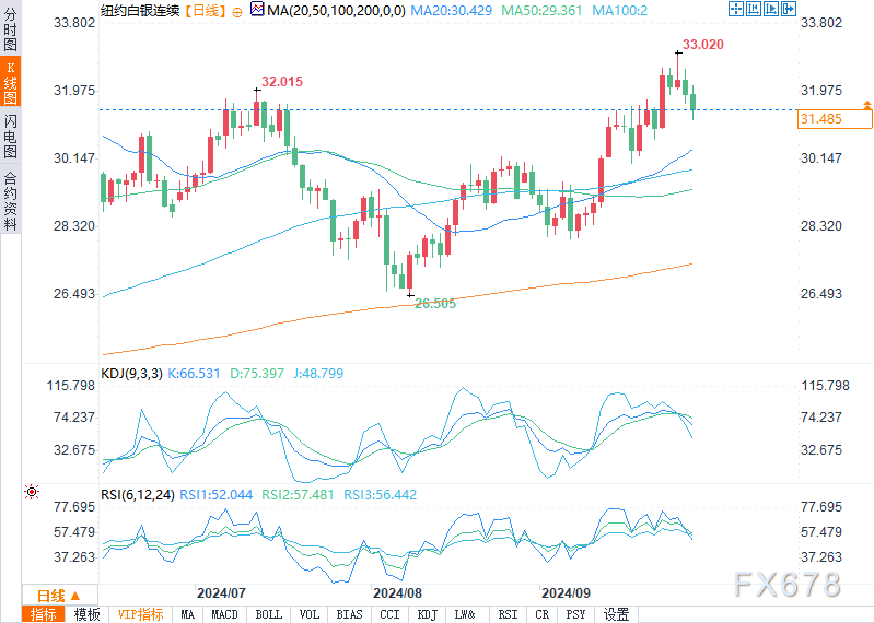 COMEX 12月白银期货多头近期整体技术优势稳固。在日K线图上,价格处于七周以来的上升趋势。白银多头的下一个上行目标是收于坚实的技术阻力位33.50美元上方。空头的下一个下行价格目标是收于坚实支撑位30美元以下。第一个阻力位见于32.00美元,然后是隔夜高点32.15美元。下一个支撑位见于隔夜低点31.315美元,然后是31.00美元。