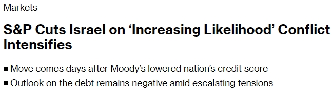 彭博社报道,标普周二在声明中表示,将以色列主权评级从A 下调至A,展望仍为负面,这是标普今年第二次下调以色列信用评分。