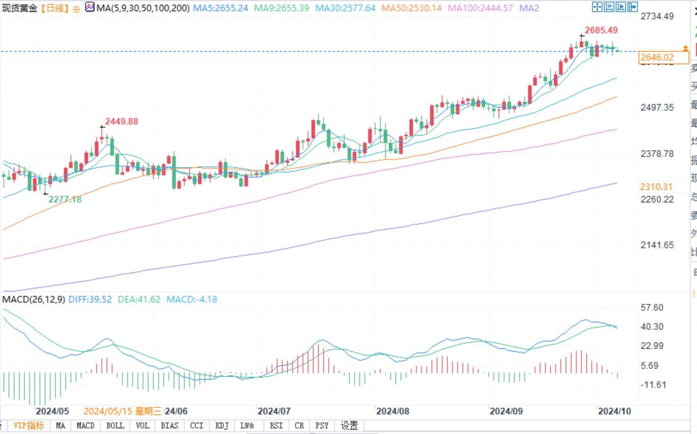 北京时间10月7日13:10,现货黄金报2646.32美元/盎司