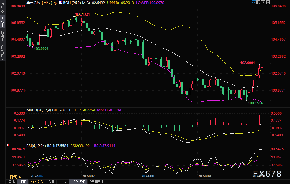 美元指数上周五触及 102.69的 8 月 16 日以来最高,日线录得五连阳,周线上涨2.02%,创下 2022 年 9 月以来的最佳单周百分比涨幅。