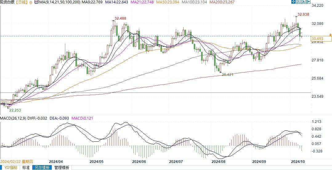 10月9日,市场分析师Haresh Menghani称,白银周三连续第三天吸引了一些卖家。技术面支撑银价进一步下跌,任何复苏都会在31.00美元附近遇阻。