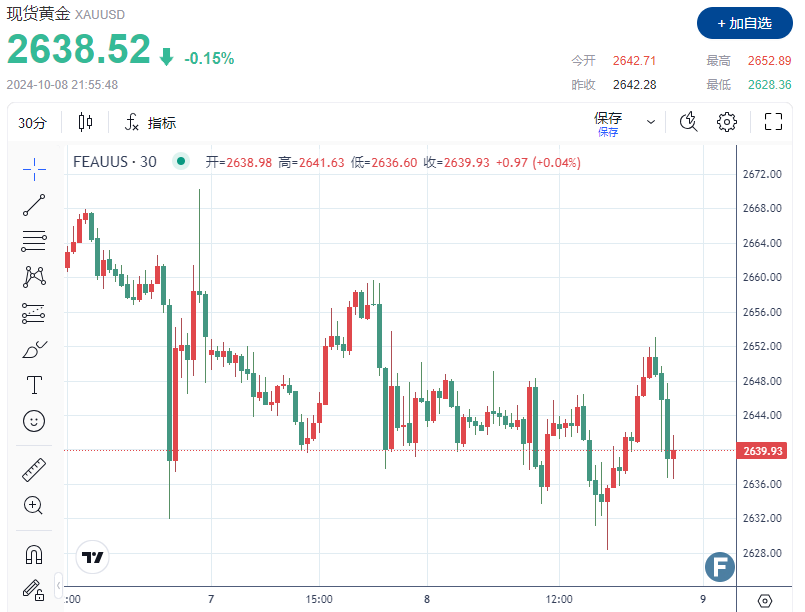 截至发稿,现货金下跌 0.15% 至 2,638.52 美元/盎司,盘中一度上涨至 2,650 美元上方。