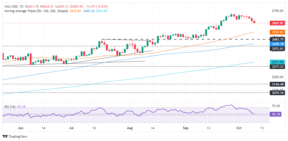 现货黄金周三收盘重挫14.13美元,跌幅0.54%,报2607.71美元/盎司。金价盘中最低跌至2605.16美元/盎司。