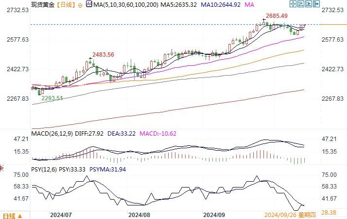 技术层面,周线级别图上,连续2周报收十字K形态,而且都是下方留有偏长的下影线。在技术指标MA均线方面,本周回撤刺穿MA5日均线后,收盘在均线之上,说明回调的需求在衰减,同样作为多头中的修正来看,没有延续性大阴和连阴走低,回撤的空间也不大,那么后面延续多头优势继续上行的动能也就有可能加大。其次,在日线方面,前期MA5日和10日均线形成死叉,日线也连续多个交易日转阴下跌,但是整体回撤的力度并不大,在9月19日拉升以后的幅度来看,回撤不到黄金分割线的61.8%的位置约2605一线,而且一直保持在2600上方,再加上在周四多次支撑2605附近不破,周五的收盘又站上MA5日和10日上方,报收大阳续涨格局,形态显示偏强运行,多头优势有可能将会延续。