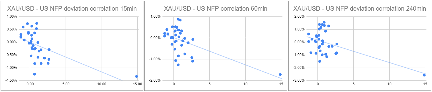 我们绘制了非农数据发布后的15分钟、1小时和4小时内的黄金价格反应。然后,我们将黄金价格的反应与实际非农结果与预期结果之间的偏差进行比较。