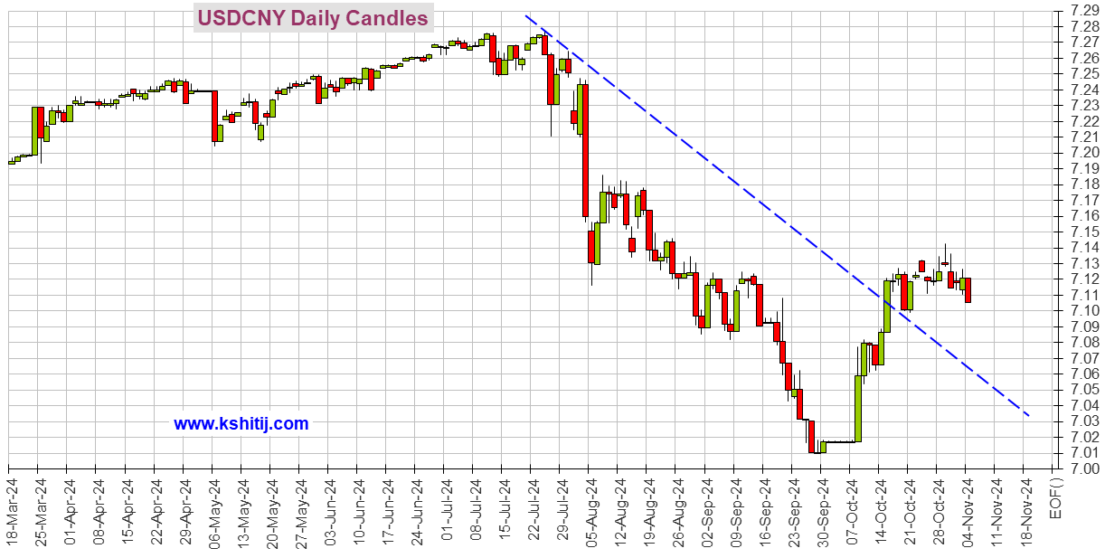美元/人民币在7.1450-7.1100区间的下端附近交易。如果美元进一步走弱,且11月4日至11月8日之间举行的刺激措施会议的任何最新消息有利于人民币,那么美元/人民币可能在近期跌破7.10,测试7.05-7.00。